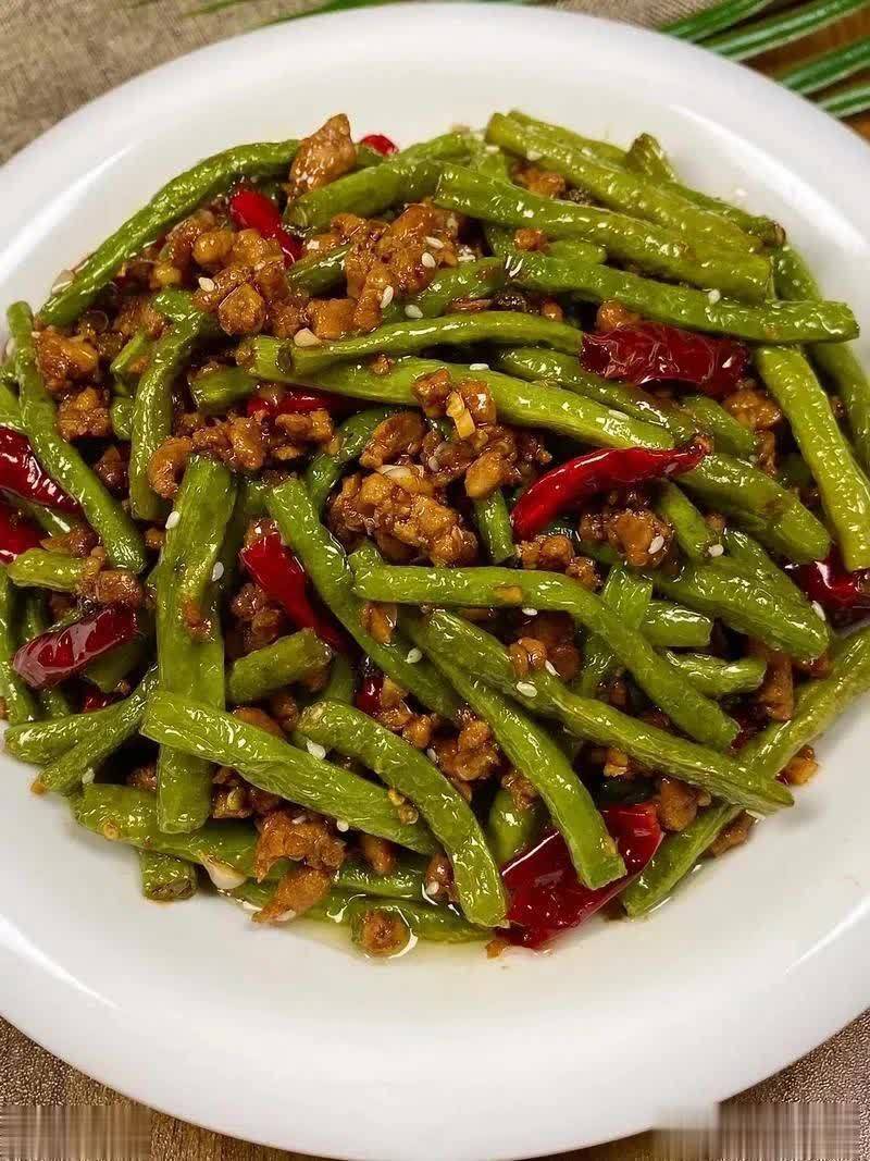 3、接着倒入豆角丁一起翻炒一分钟,然后淋入适量的清水焖煮三分钟左右。