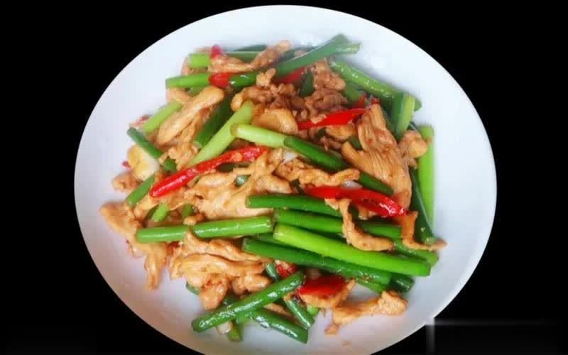 (4) 然后倒入蒜苔,接着加入半勺食盐和鸡精、1勺蚝油调味,翻炒过后即可出锅。