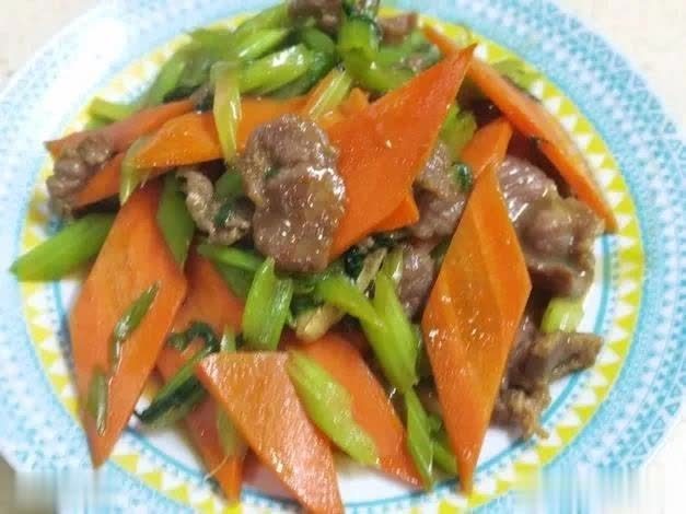 准备食材: 胡萝卜、芹菜、牛肉、姜丝、蒜末。